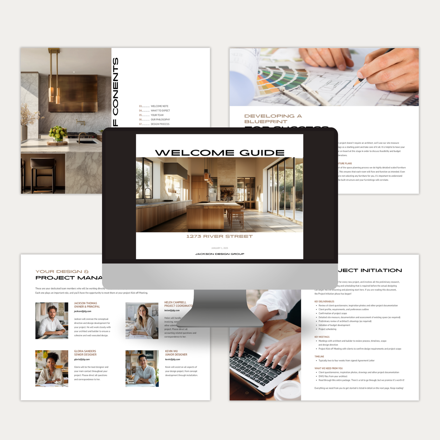 That makes our New Client Welcome Guide one of the most important templates in our arsenal. It outlines literally everything about how the project will run, and how your clients will work with your firm. It also gives you a document with friendly language to refer your clients back to at each stage of the project, or if they start to stray (without having to pull out your Letter of Agreement).